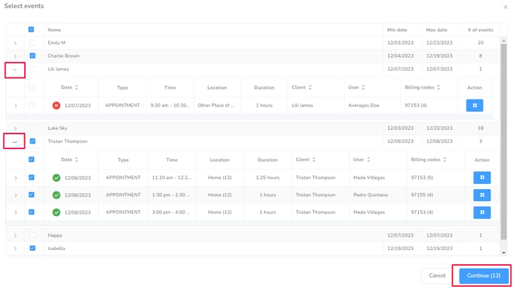 Step 11- Select the events to be included and hit Continue. (There you can check if there are any error on the events)