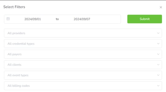 Step 10- If selected Events, then choose the Range of dates and click on Submit. Also, there are Optional filters: Providers, Credential types, Payers, Clients, Event types and Billing codes.