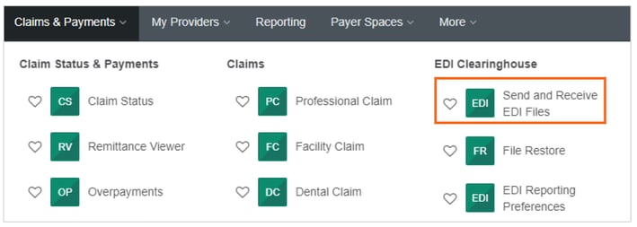 2. Click on Claims & Payments, then select Send and Receive EDI Files.