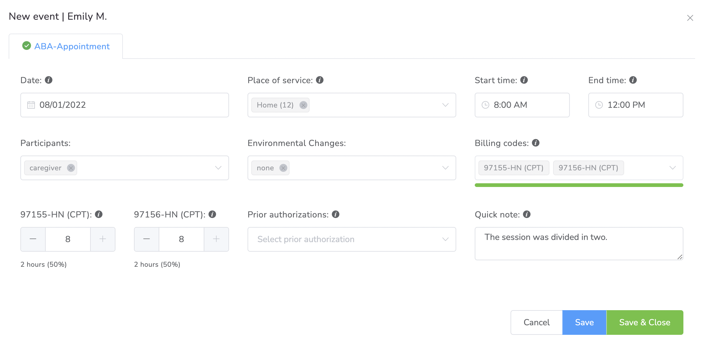We don’t have to do much since Office Puzzle natively supports all types of billing codes and the split of units by individual billing codes. Below you will find an example of a BCaBA working for 4 hours (16 billable units), out of which 2 hours were for direct implementation with protocol modification and the other 2 hours for family/caregiver training.
