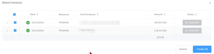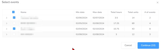 Step 6: Select the events to be included in the invoice and proceed by clicking “Continue.” This step also allows you to check for any errors in the selected events.