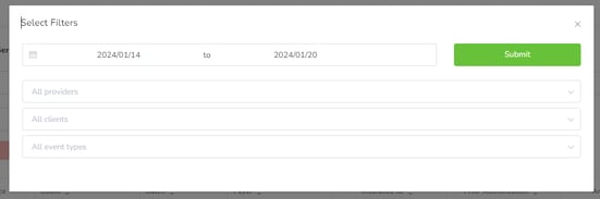 Step 5- If selected Events/Billed events, then choose the Range of dates and click on Submit. Also, there are Optional filters: Providers, Clients and Event types.