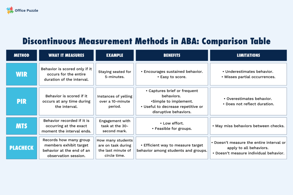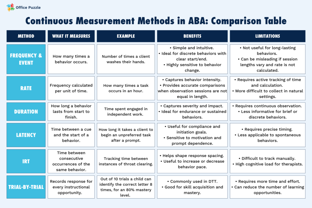 Built-in timers and automated duration tracking offered by ABA solutions such as Office Puzzle support consistent measurement across staff while reducing human error.